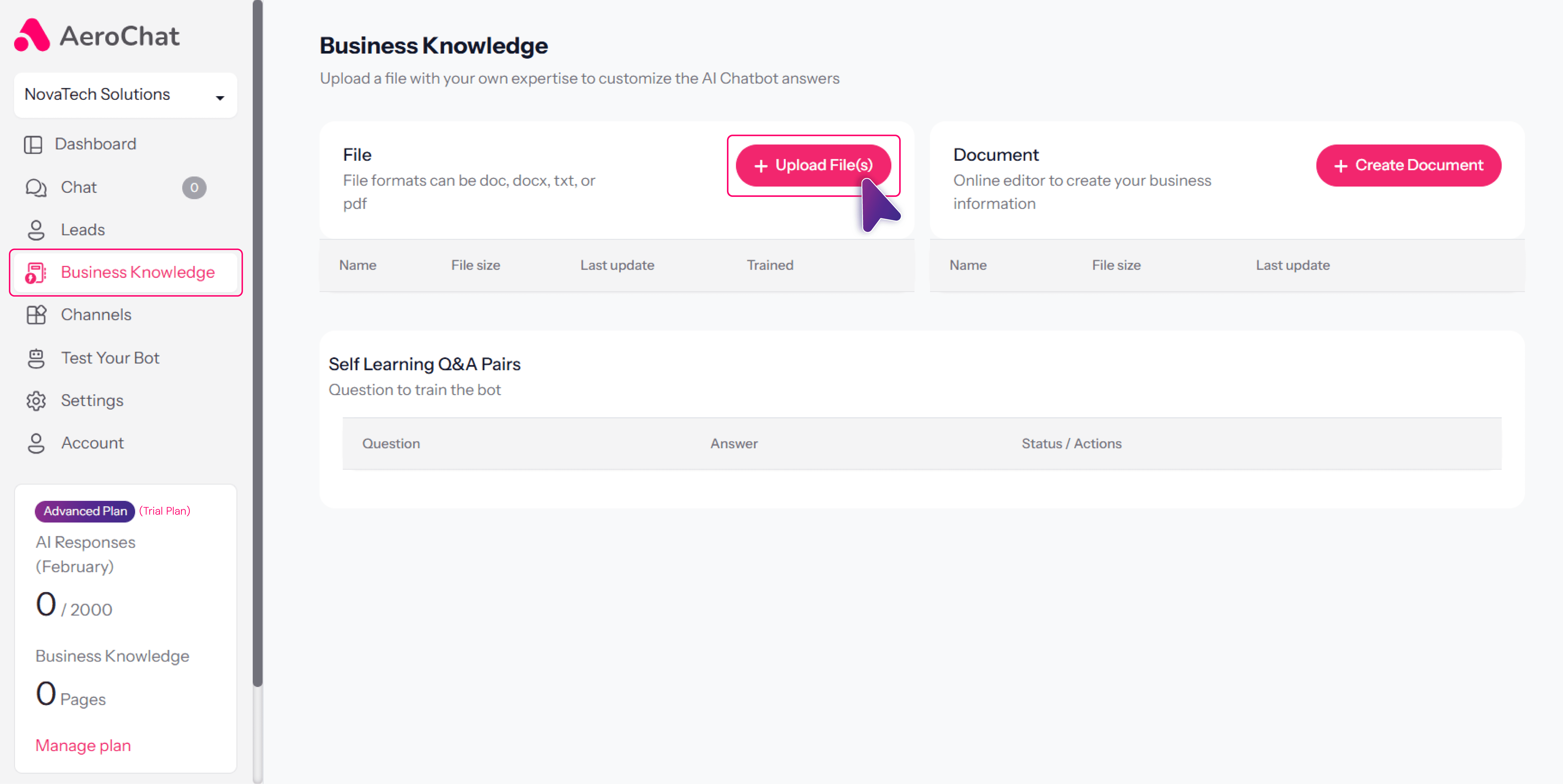 Click + Upload File(s) to upload your FAQs, product manuals, or company docs (PDF, DOCX, or TXT).